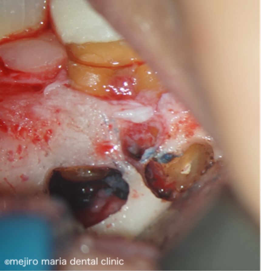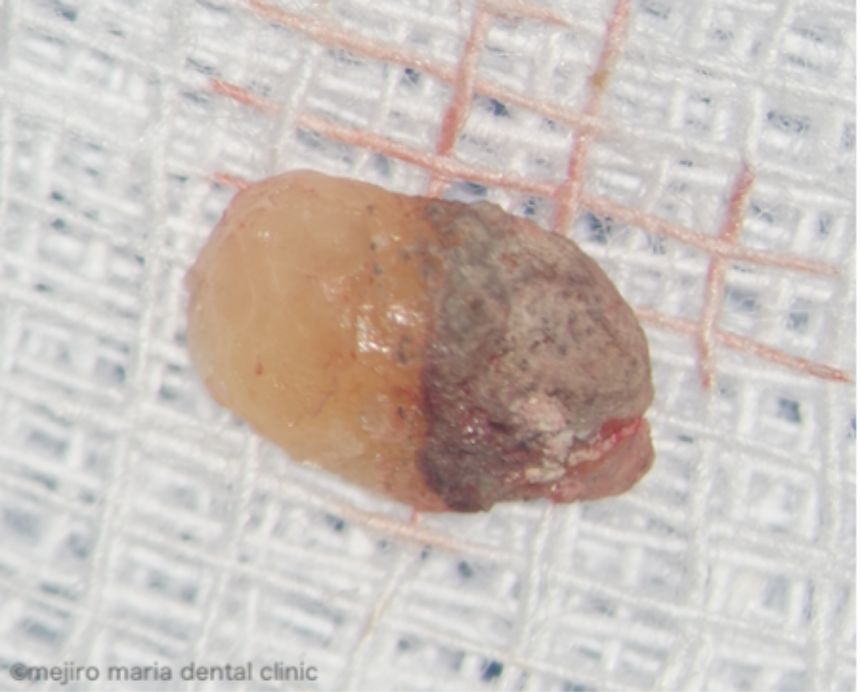 歯根端切除術時に根尖を3mmほど切断したところ、根尖を取り囲むほどの歯石が確認され、この歯石の感染が根尖性歯周炎の治癒を妨げていた可能性がありました(写真)。