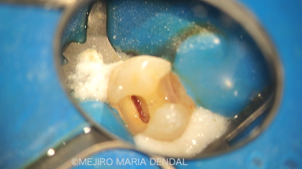 洗浄液と適切な止血によって、歯髄からの出血をコントロールできた(写真2)ことから、炎症組織は取りきれたと判断し、当日に予定どおり「生活歯髄切断法(生活歯髄療法)」を行い、経過を確認していくこととしました。
