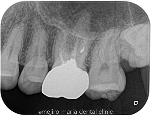 今回の患者様は口腔内の金属を除去し、全ての補綴物を非金属製のもの(ノンメタル)に変えることを希望された患者様です。被せ物の金属を除去する際に、以前に行われた根管治療のやり直しも予防的に行うことをお勧めし、精密根管治療を行うことになりました。