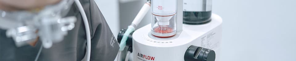 エアフローとは、14㎛のアミノ酸パウダーを歯に吹きかけることで、歯に傷を付けることなく行うクリーニングです。微粒子のアミノ酸パウダーによって通常の歯科用器具では届かない隙間まで、洗浄することができます。天然の歯はもちろん、インプラントや詰め物・被せ物、矯正装置などの隙間に付着したバイオフィルムやステイン、早期歯石を除去し、予知性の高い予防歯科を実現します。