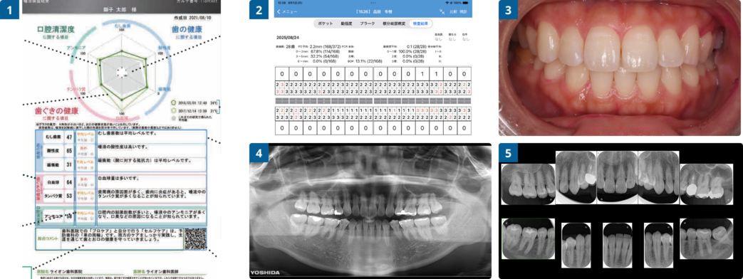 定期的に歯周ポケット検査を行うことで、歯肉炎や歯周病の増悪を確認し、歯茎の健康状態を把握します。3口腔内写真定期的な口腔内写真の記録をとることで、お口の中のトラブルが発生したとき何が原因だったかという過去の情報を確認することができます。また、染め出し後に磨き残しをご自身で確認していただくためにも活用します。